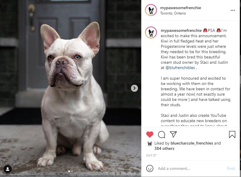 We have completed several breedings and produced litters using our Platinum Stud, Astro. If you’ve ever searched on YouTube for French Bulldog adoption or training advice, the odds are you have discovered an informative channel by Peter Kramm, MyPawesomeFrenchie. Astro was recently used in breeding with his beautiful girl, Kiwi. You can follow his Instagram account for the latest here – https://www.instagram.com/mypawesomefrenchie